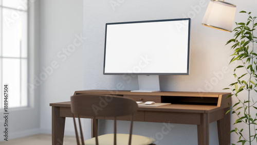 three-dimensional, rendering, illustration, indoor, background, no people, decoration, product, display, copy space, house, home, living, room, corner, wall, window, minimalist, modern, design, wood, table, desk, chair, lamp, standing, sunlight, warm, bright, clean, brown, plain, simple, working, study, plant, white, blank, screen, computer, desktop, monitor, online, cyberspace, tech, advertising