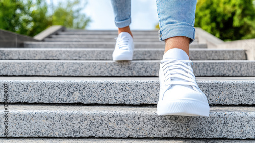 White sneaker shoe step on stone stair with casual denim pant, urban movement and relaxed mood