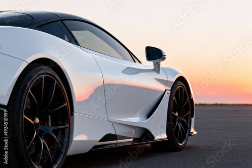 car, sports car, white, side mirror, window, door, tire, reflections, sunset, sky, horizon, asphalt, road