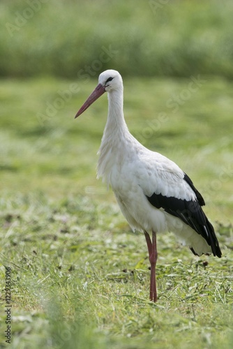 White stork (Ciconia ciconia), stands in a meadow, North Rhine-Westphalia, Germany, Europe