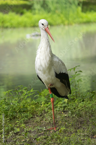 White Stork on the background of the reservoir