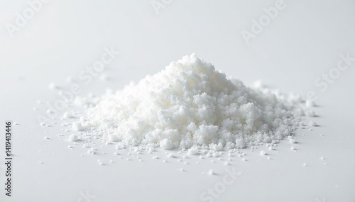 White sugar crystals scattered on white surface, still life, dessert