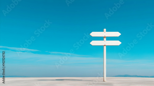 signpost, direction, choice, decision, travel, journey, guidance, destination, path, road, route, blank, empty, white, wooden, post, sky, blue, clear, bright, horizon, landscape, summer, day, minimal, simple, concept, signs