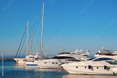 White yachts in the port waiting. On the sea is calm.