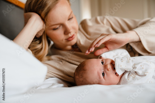 woman, adult, young, white, mother, mother, lie, bed, infant, baby, newborn, mother, little, small, children, happiness, boy, girl, children, care, smile, family, eltern, daughter, son, female, home, people, day, indoor