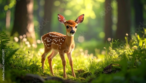 fawn, white tail, cervid, wildlife, forest, wood, nature, animal, mammal, spring, summer, sunlight, sunshine, timberland, wild, cute, adorable, young, small, green, leaf, plant, grass, outdoors, environment, beautiful, scenic, peaceful, tranquil, serene, magical, baby animal, wild animal, future