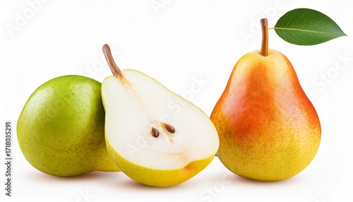 Whole And Halved Yellow Green Pears With Leaf Isolated On Transparent Background