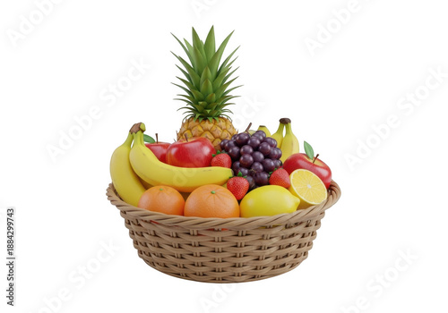 fruit, food, healthy, fresh, organic, produce, variety, assortment, basket, wicker, pineapple, apple, banana, grape, strawberry, orange, lemon, red, green, yellow, natural, nourishment, vitamin, raw, wholesome