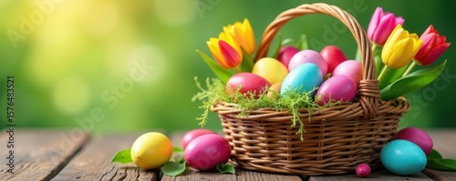 Wicker basket overflowing with vibrant painted eggs & tulips, celebrating Easter , easter eggs, decoration, Easter decorations