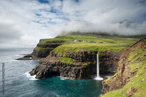 waterfall, cliff, ocean, atlantic, landscape, travel, tour tourism, nature, scenic, green, grass, mountain, cloud, mist, foggy, village, remote, nordic, scandinavian, island, water, falling, sea, coastline, rock, geology, destination, adventure, outdoors, fisheye, morning, light, serene, peaceful, dramatic, majestic, iconic, landmark, wild, vacation, get-away, exploration