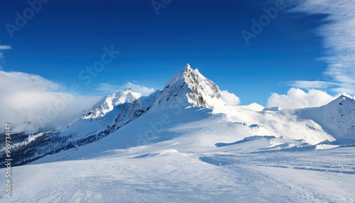 Wide angle view landscape of white snowy peak in mountain range with clear blue sky. Nature concept for lifestyle product background
