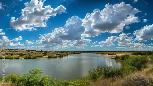 Wide Angle View of the Colordao Riverin Texas With Large Clouds in the Sky : Generative AI