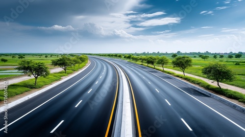 Wide modern highway with multiple lanes surrounded by trees and fields under bright sky representing transport infrastructure mobility and freedom, Generative AI