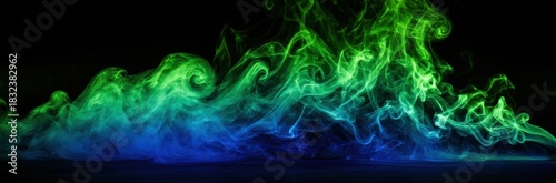 Wide panoramic abstract background of swirling neon green and blue smoke rising from the bottom.