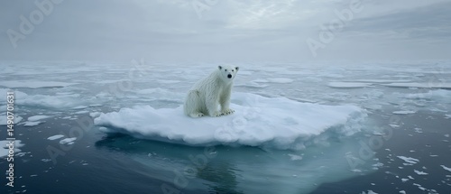 Wide shot of A polar bear stranded on a small piece of ice in the Arctic Ocean.
