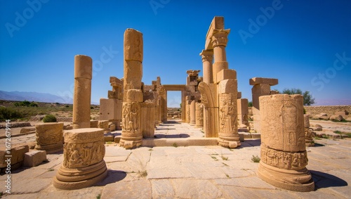 Wide shot of ancient weathered stone columns and intricately carved ruins standing proudly on a dry, rocky terrain under a clear vibrant blue sky and bright natural sunlight, with distant mountains vi