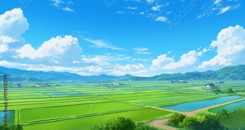 Wide View of Expansive Rice Fields in Japan with Cel Shading Under Clear Blue Skies