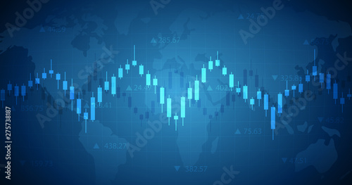Widescreen Abstract financial graph with candle stick and world map on blue color background