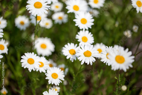 Wild chamomile flowers on a field on a sunny day.