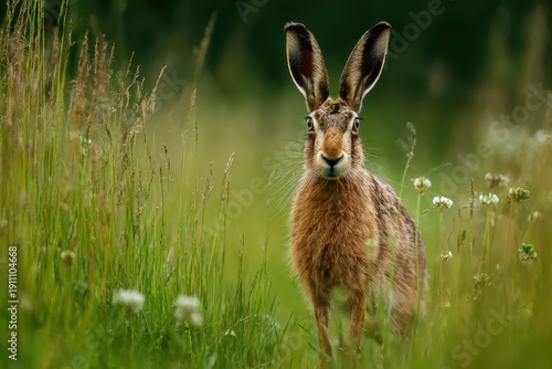 hare, rabbit, meadow, grass, field, wildlife, nature, outdoors, natural light, daylight, standing, closeup, low angle, eye contact, spring, greenery, nature scene, gaze, animal, mammal, serene, calm, bokeh, alert, tranquil, summer, candid, environment, foliage, portrait, rural, vegetation, sunlight