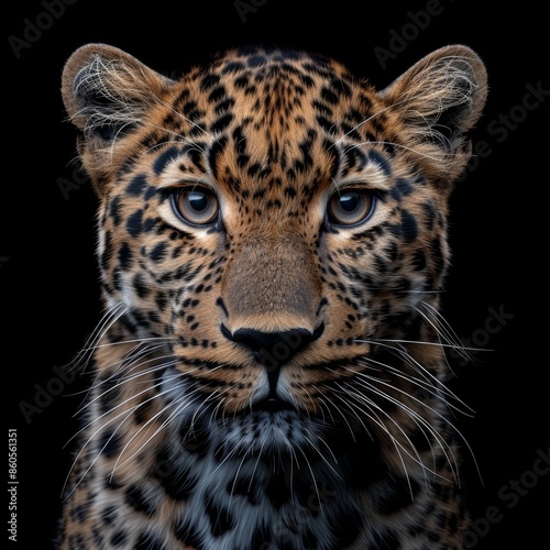 leopard, wildlife, portrait, animal, face, camera, photorealistic, detailed, fur, texture, black, background, nature, wild, closeup, encounter, mammal, predator