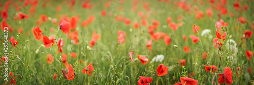 Wild red poppies growing in green wheat. Wide banner with shallow depth of field, only front flowers in focus