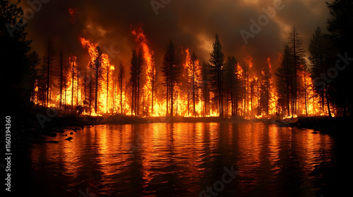 wildfire, fire, forest fire, forest, flames, burning, tree, water, night, smoke, heat, danger, disaster, emergency, inferno, blaze, hot, destruction, damage, nature, environment, climate change, global warming, drought, dry, burn, conservation, ecology, habitat, loss, impact, pollution, risk, safety, prevention, preparedness, response, recovery, community, support, help, donate, volunteer, climate, weather