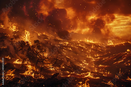 Wildfires consume vast landscapes, fueled by dry conditions and strong winds, leaving trails of destruction in their wake.