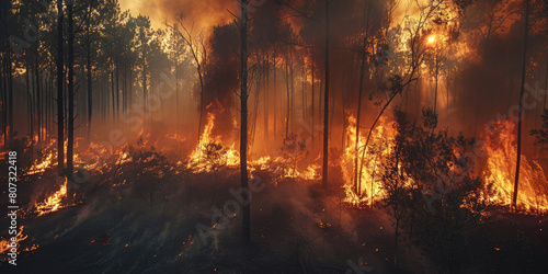 Wildfires, Smoke from wildfires in forests causes PM 2.5 pollution. Generative AI.