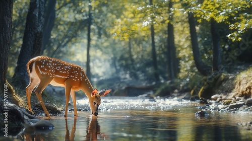 Wildlife scene featuring a deer drinking from a crystal-clear stream in a tranquil forest