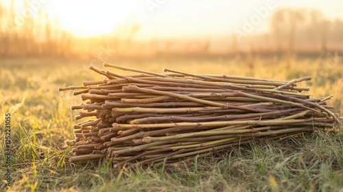 willow, branch, bundle, field, sunrise, gold, harvest, agricultural, craft, nature, rustic, morning, light, fresh, wood, stack, grass, dew, twig, farm, agriculture, countryside, rural, season, sunlight, bright, closeup, background, plant, autumn, tree branch, material, natural, nobody, stem, design, pattern, landscape