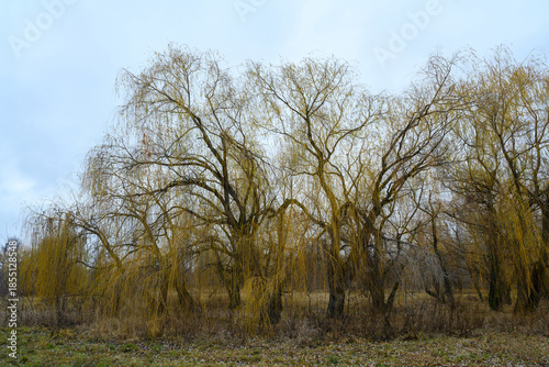 Willow trees dance in the soft breeze beneath a cloudy autumn sky