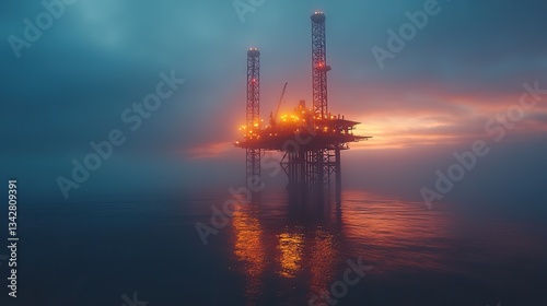 oil well, sea, foggy, dusk, reflecting, calm water, surreal, rig, ocean, fog, sunset, energy, industry, offshore, landscape, nature, environment, sky, tower, antennae, oil, communication, technology, radio, gas, telecom, industrial, blue, transmitter, television, drilling, mobile, metal, crane, silhouette, construction, wireless