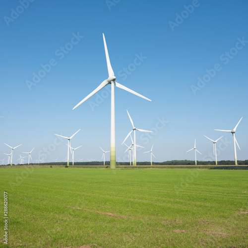 wind turbines in rural landscape of ostfriesland in the north of germany and blue sky