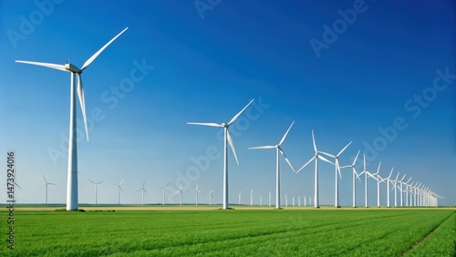 Wind turbines line a vibrant green field under a clear blue sky, symbolizing renewable energy and sustainability.