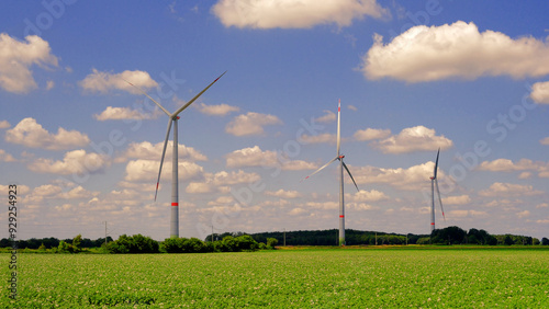 Wind turbines or a group of wind energy converters in Germany against the backdrop of a sunny summer landscape and a flowering potato field. Green energy concept.