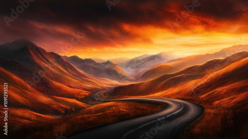 winding, asphalt, road, meandering, vibrant, mountain, sunrise, breathtaking, panoramic, view, rich, hue, dramatic, cloud, illuminating, natural, landscape, scenery, travel, nature, beauty, serene, timeless, scenic, adventure, nobody