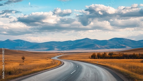 Winding asphalt road through golden landscape, mountains in the distance