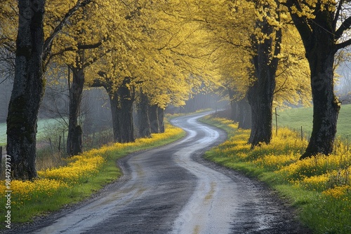 flower, yellow, field, road, dirt road, winding road, spring, nature, landscape, blooming, blossom, rural, countryside, scenic, idylli, colourful, vibrant, peaceful, serene, beauty, natural, meadow, agriculture, farm, crop, canola, rapeseed, mustard, blowball, wildflower, tree, forest, hill, mountain, sky, cloud, sunny, springtime, journey, destination, travel, adventure, exploration, wanderlust, freedom, hope, growth