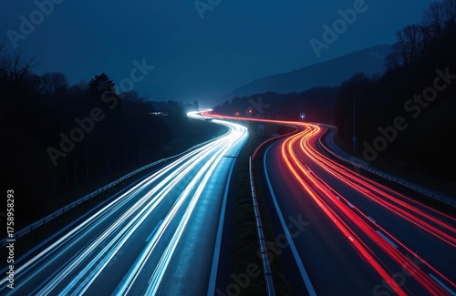 Winding highway at night with long exposure traffic. Red, white light trails from cars create streaks of motion. Fast moving vehicles blur on curved motorway. Road represents speed, connection,