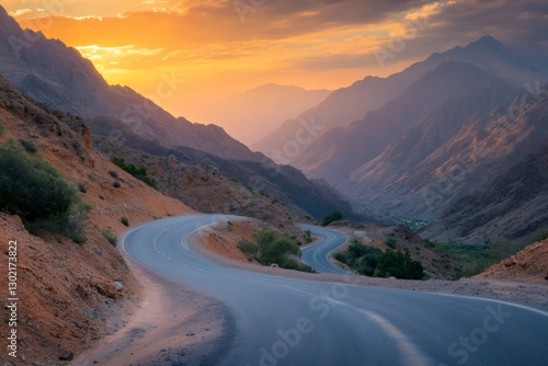 road, mountain, sunset, landscape, morocco, winding, travel, nature, scenery, mountain chain, dusk, evening, scenic, drive, journey, adventure, destination, asphalt, transportation, winding road, mountain road, road trip, curve, outdoors, wanderlust, exploration, tour tourism, picturesque, dramatic, golden hour, north africa