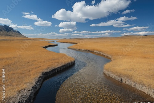 Winding river flows through golden grasslands under blue sky with scattered clouds