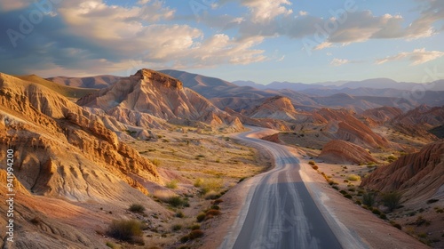 road, desert, mountain, landscape, sky, hill, canyon, nature, path, horizon, travel, journey, adventure, scenic, vista, outdoors, panorama, wild, rock, curve, winding, geology, earth, view, countryside, sun, cloud, afternoon, summer, warm, colours, gold, orange, brown, red, blue, green, light, shadow, wide, angle, photo