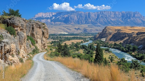 canyon, river, road, mountain, vale, nature, scenic, landscape, travel, adventure, wilderness, summer, sky, cloud, blue, green, brown, yellow, rocky, dirt, gravel, tree, grass, water, horizon, perspective, scenic route, winding, path