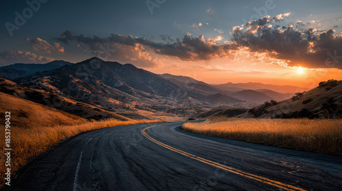 Winding road through golden fields leading to mountains at dramatic sunset with vibrant sky