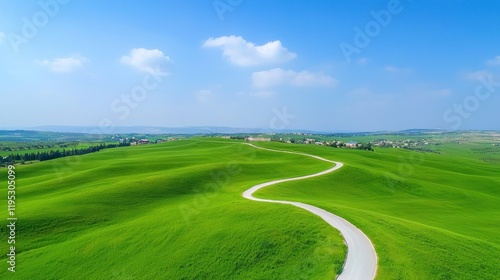 path, road, winding road, hill, grass, greengrass, landscape, scenery, nature, summer, daytime, sunny, bright, horizon, sky, blue skies, cloud, white cloud, tree, field, countryside, rural, serene, peaceful, calm, tranquil, scenic, view, vista, travel, journey, adventure, exploration, discovery, open space, meadow, farmland, agriculture, environment, ecology, natural beauty, aerial view, perspective, curve