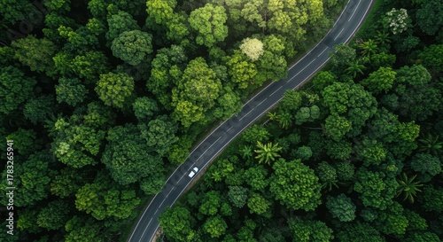 Winding Road Through Lush Forest: A captivating aerial view captures a serpentine road weaving through a vibrant forest canopy, showcasing nature's artistry and the allure of exploration.
