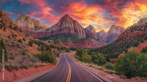 road, canyon, sunset, mountain, sky, cloud, red, rock, cliff, desert, landscape, nature, scenic, travel, adventure, outdoors, scenery, horizon, dusk, evening, light, colours, picturesque, beautiful, majestic, awe, inspiring, huge, wilderness, national, park, america, utah, zion, national park, highway, asphalt, curve, yellow, line, tree, bush, foliage, vegetation, ground, dirt, gravel