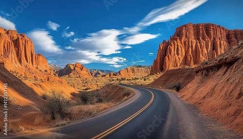 road, winding, canyon, red, sandstone, blue, sky, cloud, desert, rock, cliff, dramatic, nature, landscape, erosion, geologic, formation, barren, texture, sunlight, shadow, orange, earth, arid, panoramic, remote, majestic, serene, adventure, travel, horizon, curve, expanse, weathering, strata, layer, outback, isolation