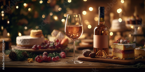 Wine Bottle and Glass on Rustic Table with Cakes, Dessert Cheeses, and Fruits